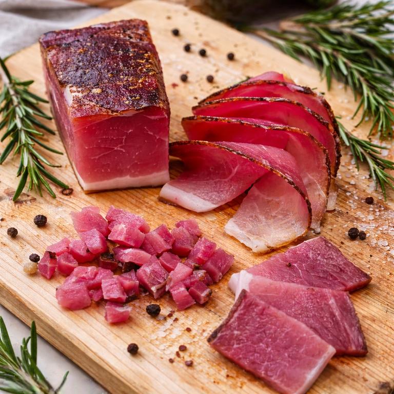 kalt geräuchert und dann mindestens 22 Wochen an Südtiroler Bergluft gereift, veredelt mit sanfter Bergkräuterwürze, mild im Geschmack